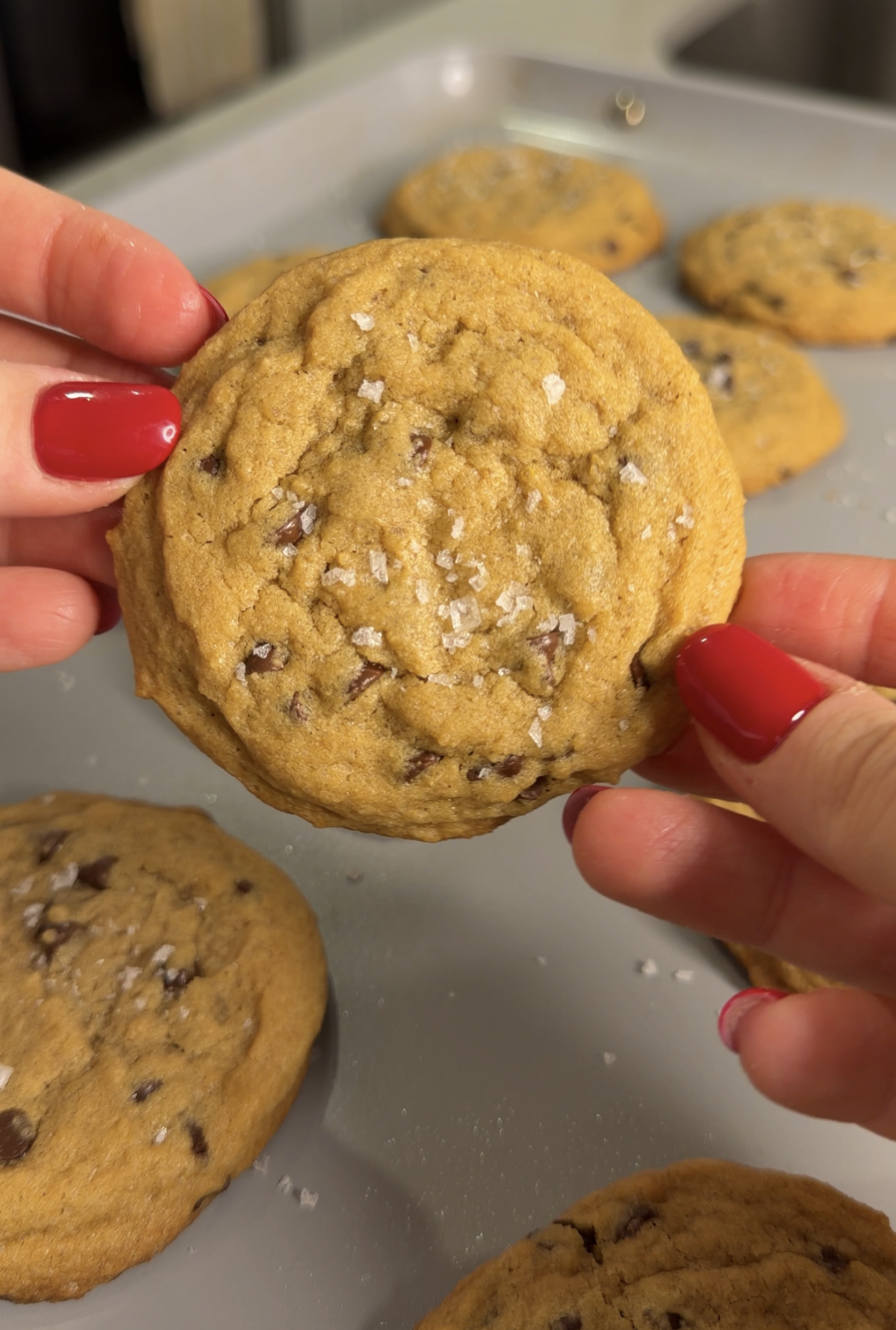 - Immediately sprinkle with flaky sea salt. Let the cookies cool on the baking sheet for 5 minutes, they will continue to set and gently deflate. Transfer to a wire rack to cool completely.