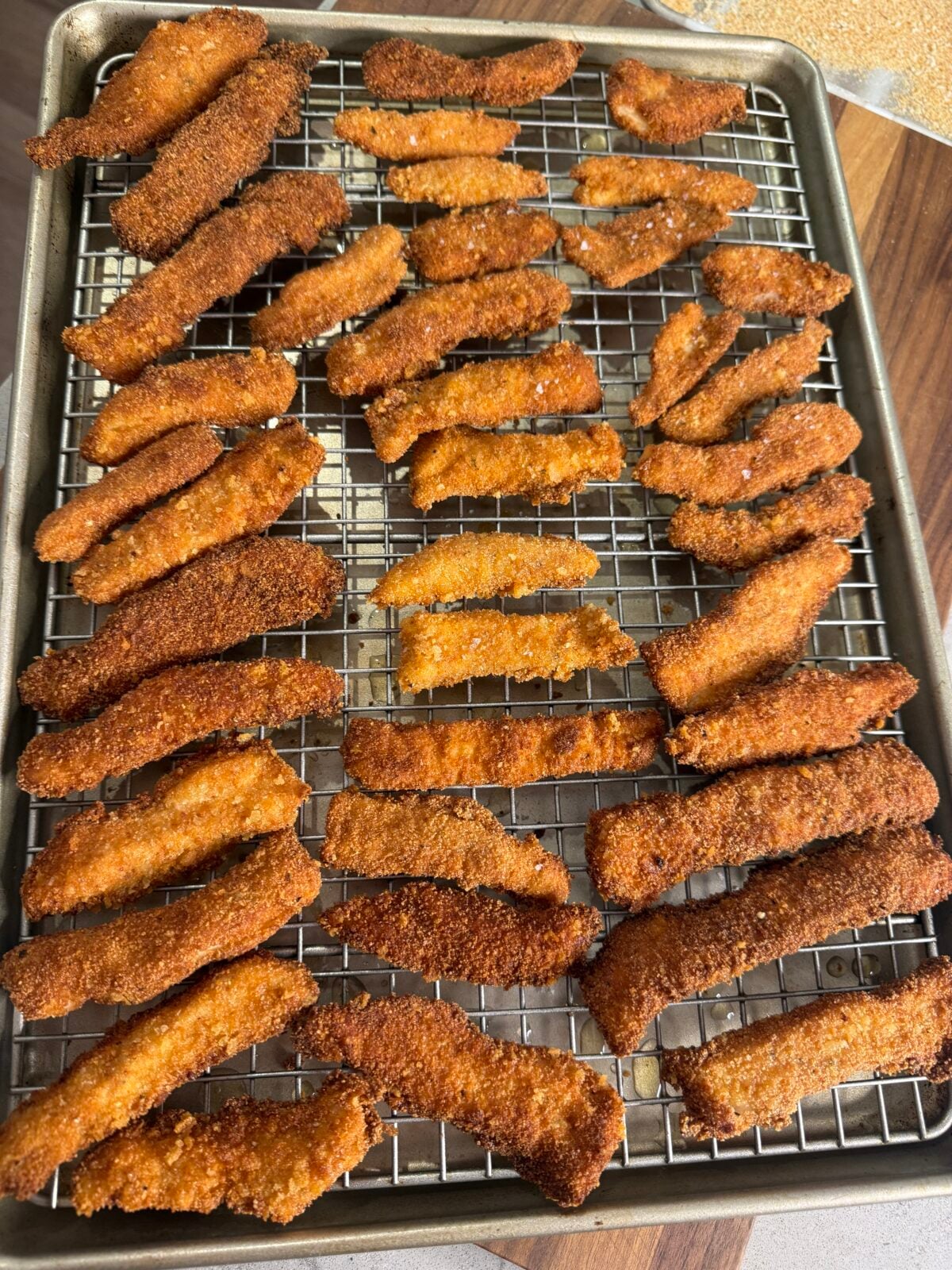 Instead of breading whole cutlets and slicing after, I cut the chicken first, then breaded each strip by hand. It takes a few extra minutes, but it guarantees the breading stays put and every piece fries evenly. Pressing the breadcrumbs in is non-negotiable here, it’s what gives you that shatteringly crisp exterior.