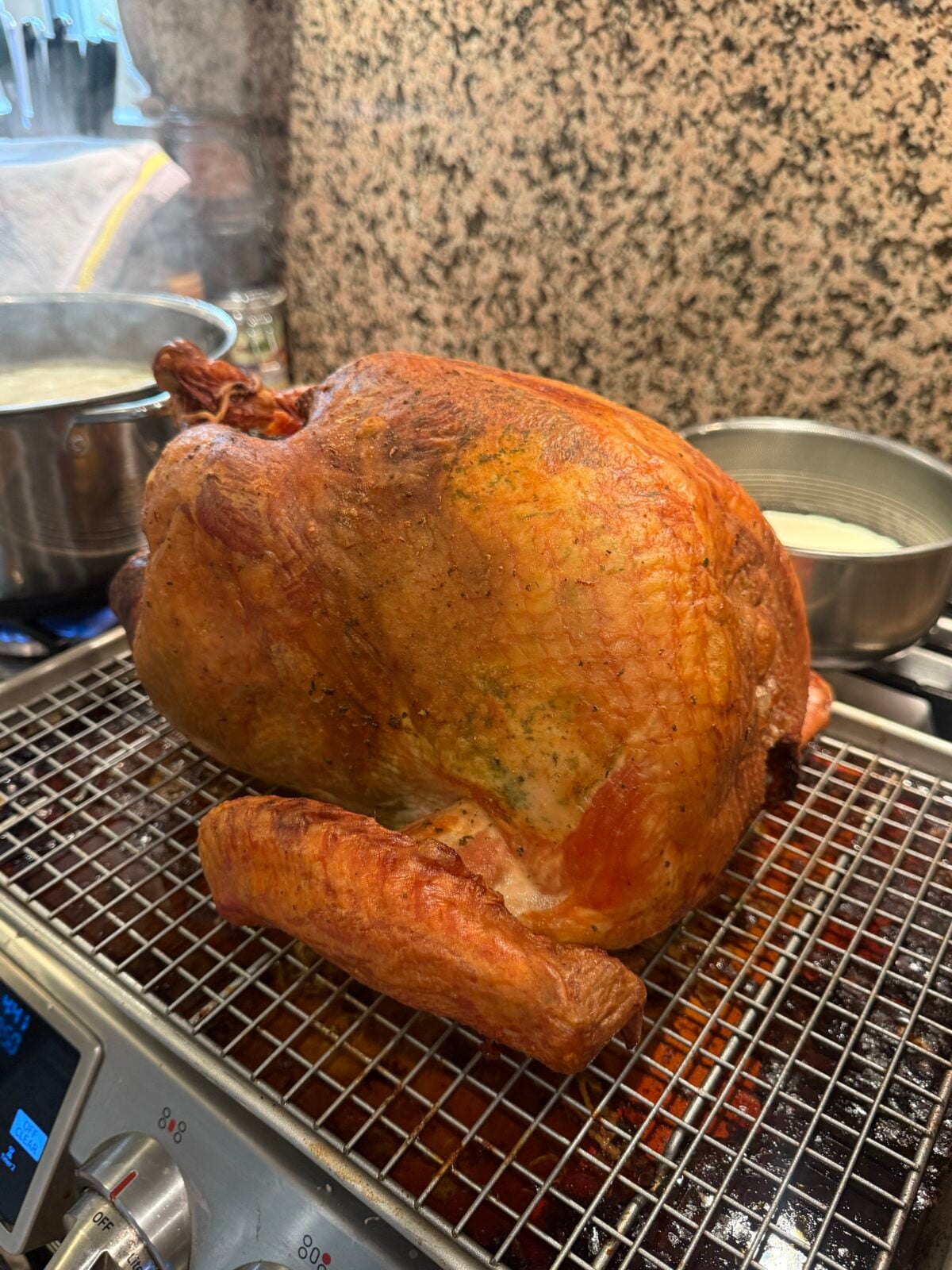 While the classic formula is about 12 minutes per pound, my 15-lb turkey cooked in just 2 ½ hours — and the breast could’ve come out even a touch earlier if I’m being honest.
