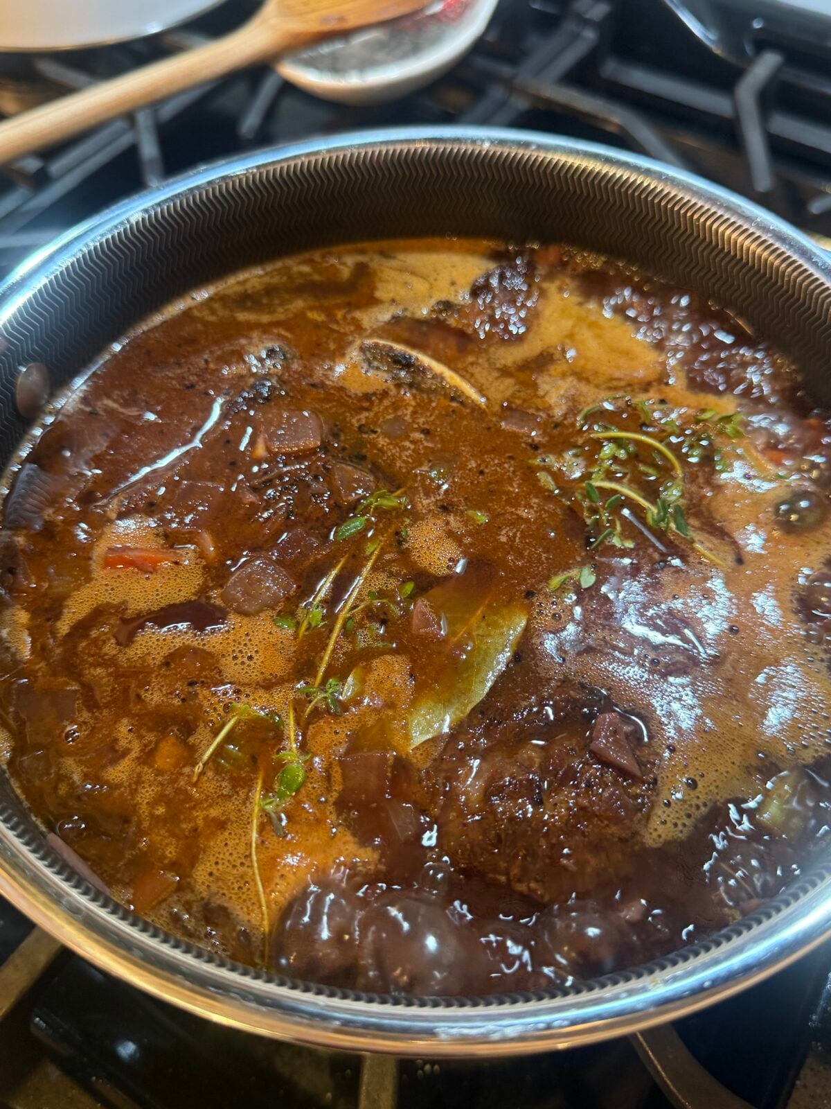 Traditionally they’re braised with red wine, something dry and full-bodied, but if you don’t use wine, all stock works beautifully too. A small splash of balsamic brings the acidity you’d normally get from wine. It’s less about strict rules and more about understanding balance and ratio.
