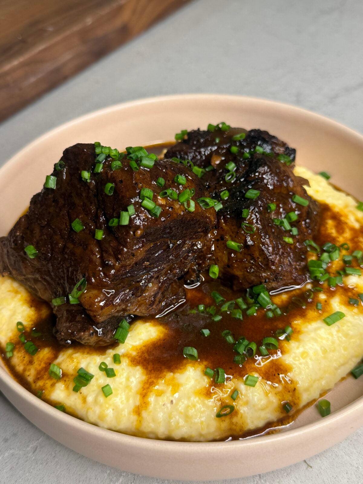 Spoon polenta into shallow bowls. Top with short ribs, spoon over the sauce, and finish with fresh chives.
